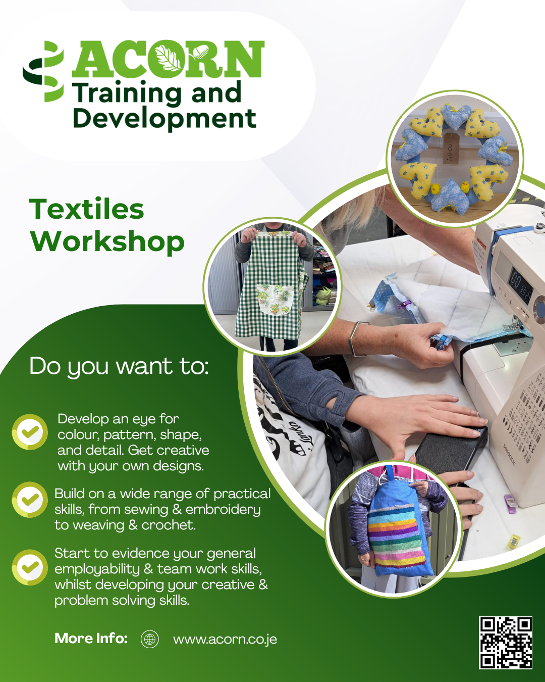 We will help you identify an achievable product to work on, depending on skill and sewing experience, then using a range of skills you have learned and developed you can complete your item. This is then sold in our Acorn shop.
