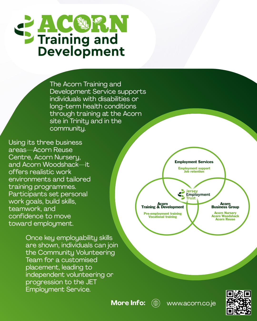 The Acorn Training & Development Service offers individuals with a disability or long-term health condition the chance to engage in a variety of training and volunteering opportunities at our Acorn site in Trinity and also within the wider community.